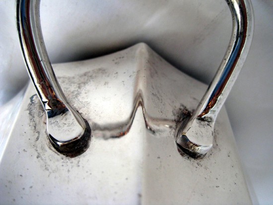 This French art deco oval ice bucket was made in the 1930’s. The silver plated bucket with reticulated sides and attached handles was hand formed. The bucket is 4 ½” high x 9 ¾” long x 5” wide.