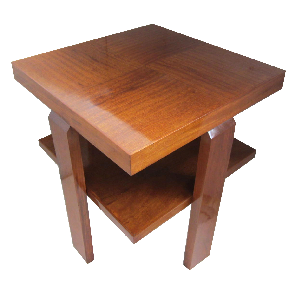 This special French art deco occasional table is from the 1930’s. The table is constructed from figured mahogany and mahogany veneers. Supported by four legs with beveled tops, the table has two levels. The top has four quadrants of book matched stripe mahogany veneers. In the shelf below, there is a small cabinet very cleverly hidden. The table has been refinished and is 24” high and 21” each side and has enough presence to be a coffee table or a side table.