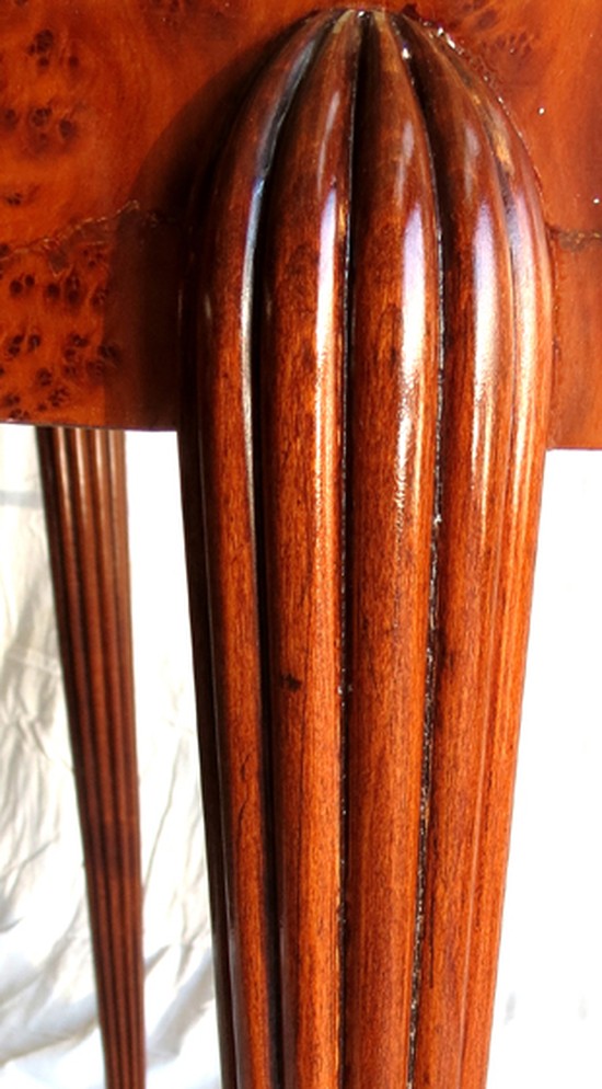 This elegant French art deco occasional or tea table is from the late 1920’s. The top and sides are mahogany burl, the beveled edge is zebra wood. The tapering reeded legs are positioned outside of the table. The oval table is 31 ½" x 22" and stands 29 ½" tall. It has been professionally refinished and is in excellent condition.