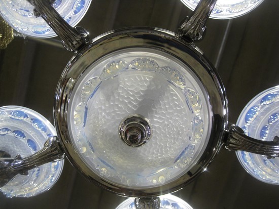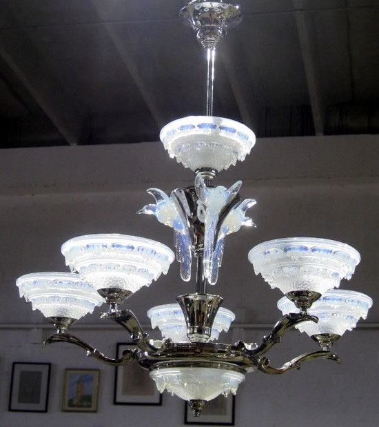 An amazing and spectacular 1930’s French Art Deco chandelier! With its nickel shaft, cones, wings and rings supporting seven illuminated opalescent glass bowls dripping icicles and three illuminated opalescent glass birds in flight, this fixture will be the centerpiece of any room. The chandelier drops 36” from the ceiling (can be shortened) and is 30” in diameter. The nickel has been replated and the fixture is rewired for American electricity.