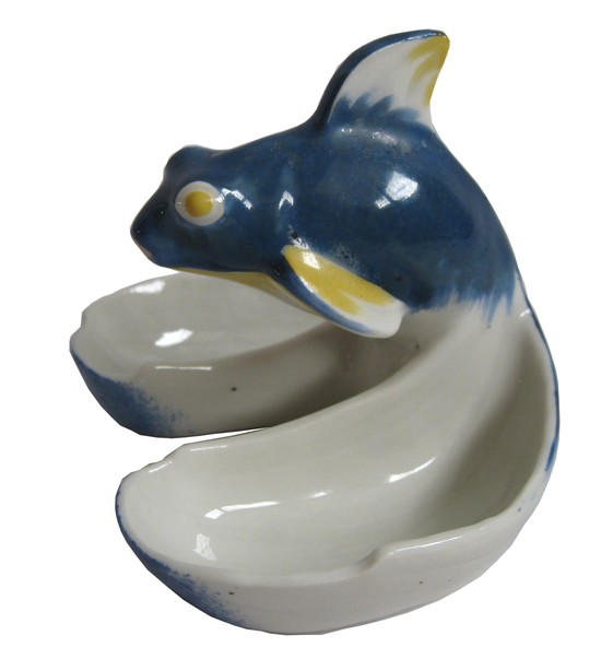 This French art deco porcelain double salt cellar was designed in 1917 by Edouard-Marcel Sandoz (1881 - 1971) for the Haviland Limoges Company. The “Flying Fish” with blue body and yellow eyes and fins stands guard over your salt. Known as “Saliere Poisson”, it is number 28 in the company literature. It is pictured on pages 80 and 132 in “Les Creations en Porcelaine D’ Edouard-Marcel Sandoz” by Jean Segonds. The cellar is 3” high and 3 ½” wide and is in excellent condition.