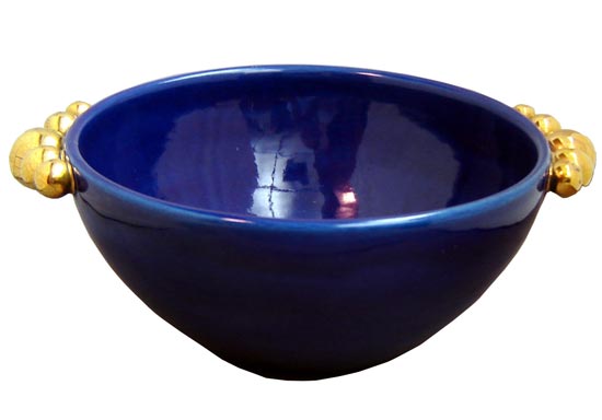 This striking French art deco ceramic bowl was produced for the French firm Robj. The bowl is glazed in sevres royal blue with fine graduated gold balls on each side. The bowl dates from the 1930s and measures 8” in diameter. (10” from ball to ball) and is 3-3/4” high. It is signed on the base “Robj”.
