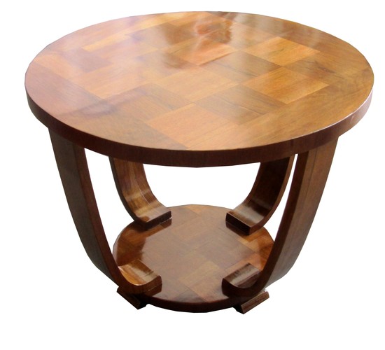 This French art deco coffee table is from the 1930’s. Constructed from rosewood and rosewood veneers, the table has a parquetry top and bottom shelf. Four gently curved legs connect the 27” diameter top to the 15” diameter bottom shelf. The table rests on four rounded feet and is 20” high. It is in excellent condition.