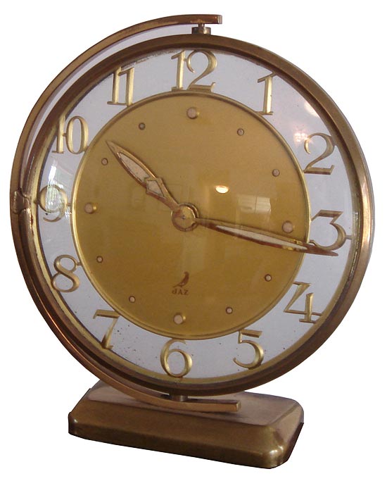 A fine French art deco table clock by the Compagnie Industrielle de Macanique Horelogere which used the trademark “JAZ” from 1919 to 1941. This clock is from a line of deco clocks that the company introduced in 1934. The circular brass clock frame encloses the floating numerals around a gold ground. The clock body swivels horozontically. The clock is 5-1/2” high and 4-1/2” wide. The clock is marked “JAZ” on the front and back an dis also marked on the back “modele depose, Made in France”.