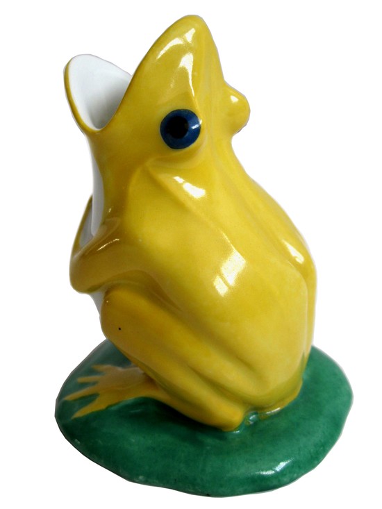 This humorous French art deco porcelain vase was designed by Edouard Marcel Sandoz (1881 – 1971) for the Haviland Limoges Company in 1916. The yellow frog on his green lily pad seems to be belting out an aria with his hand on his chest. The vase, known as “Porte – Bouquet - Grenouille” is number 36 in the Catalogue Raisone. It is pictured on page 134 in “Les Creations en Porcelaine d’ Edouard Marcel Sandoz” by Jean Segonds. The vase is 6” high.