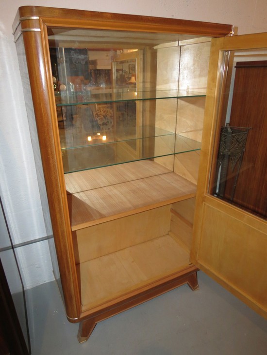 This French art deco vitrine is from the 1930’s and is remarkable for the high quality of its finish and attention to detail. The body is of select striped mahogany veneers with beech trim and bronze fittings. It even has its original key. The top portion has three shelves for display, the bottom is reserved for storage. The front feet have bronze sabots. The vitrine is 60 ¾” high, 35 ½” wide and 18” deep. It is in excellent condition.
