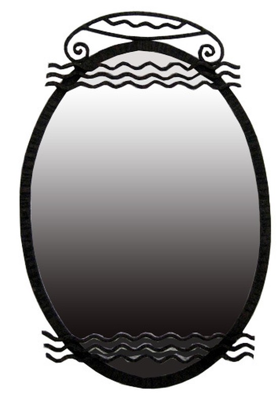 This amusing French art deco oval mirror dates from the 1930s and is ready for that special place in the home. The frame is of hand wrought iron with three wavey lines across the top and bottom. The mirror measures 26” high and is 17 ¼” wide.