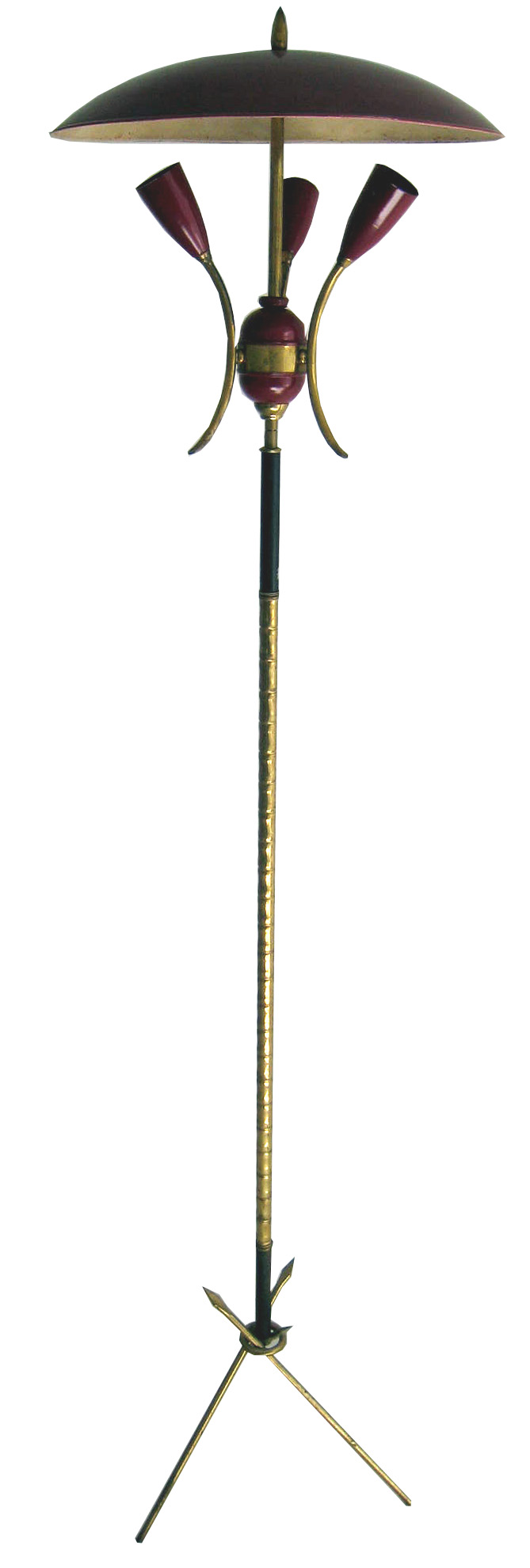 This French floor lamp is from the 1950’s and exhibits the spirit and spunk of that period. In brass and wine colored enamel, the lamp sits on a tripod base of three arrows with a 17” diameter shade over three cups with ball light bulbs. The lamp has been rewired for American electricity and is 70” tall.