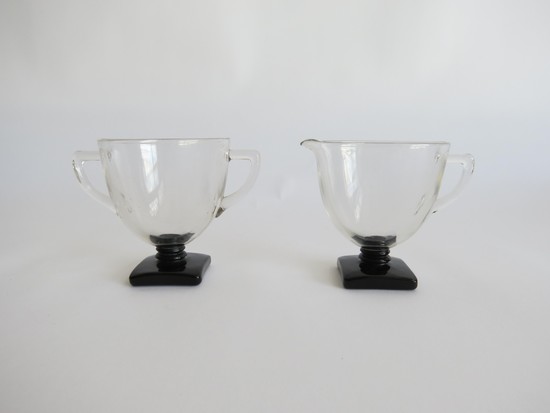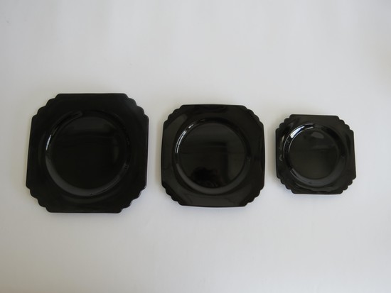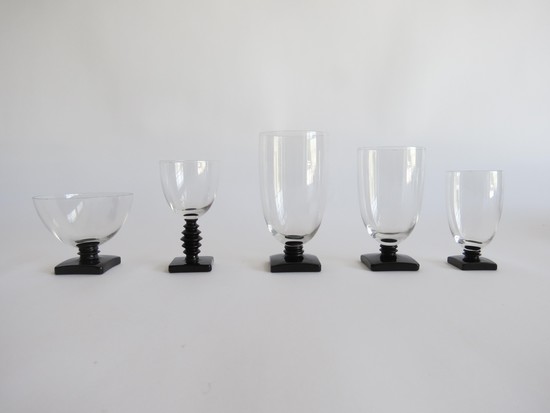 George Sakier (1897-1988) designed this very art deco 72 piece service for the Fostoria Glass Company, Moundsville, West Virginia in 1929 and 1930. The drinking vessels are from his 4020 line and feature a square ebony foot with stacked ebony stem and crystal bowl, the sugar and creamer are from the same line. The three sizes of plates are in ebony glass and are from his Mayfair line, as are the ebony glass cups and saucers. The two large serving bowls, the six ramekins and the two candle holders are all in ebony glass from his 2402 line.