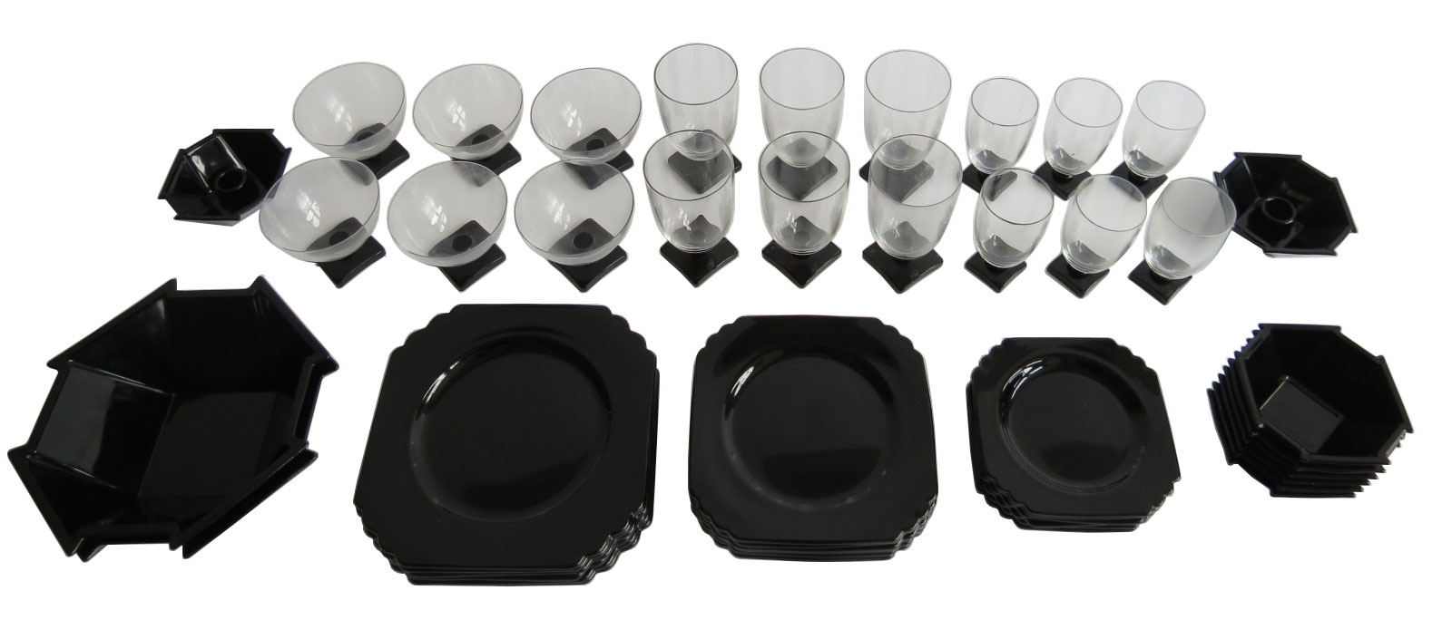 This forty six piece luncheon set for six designed in 1929 and 1930 by George Sakier (1897-1988). It was produced by the Fostoria Glass Company of Moundsville, West Virginia. The set consists of: 6 4020 Goblets 6 4020 Juice Glasses 6 4020 Low Sherberts 6 2419 8” Mayfair Plates 6 2419 7” Mayfair Plates 6 2419 5 ½” Mayfair Plates 6 2402 4” Fruit Bowls 2 2402 8 ½” Serving Bowls 2 2402 Candlesticks