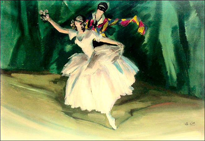 This oil on canvas painting by Charles Felix Gir (French 1883 – 1941) titled “La Ballerine et l'Arlequin" shows the dancers against a green curtain. The painting measures 18" x 25 ½" and is in a gold leaf frame.
