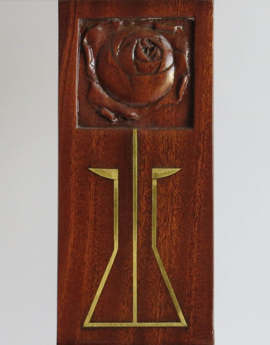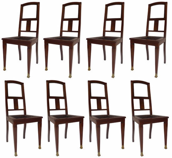 An important Belgian art nouveau dining set attributed to Henry Van De Velde (1863-1957). The set consists of a dining table with three leaves, eight chairs, a buffet and a sideboard. This magnificently crafted solid mahogany set features hand carved roses on drawers, doors, chair back plates, and the table apron. Vertical brass stringing and inlaid mother of pearl details all add a unified sense of rich elegance. There are bronze kickplates on the buffet and server and bronze sabots on the table and the front legs of the chairs. The table is 43” wide by 53 1/2” long (91 1/2” long with the three leaves) and 30” high. The buffet is 79” long, 23 1.2” deep and 43” high and the server is 55” long 21” deep and 471/2” high. The set has been professionally restored and is in impeccable condition and only awaits your choice of fabric for the chairs.