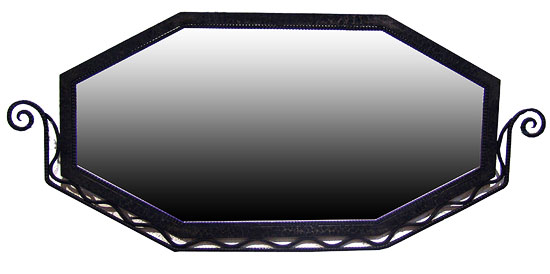 This French art deco hand wrought iron mirror dates from the 1930’s. The eight sided hammered frame is surrounded on the bottom with a decorative wave element and a lower band that terminates in a swirl on either side. The mirror measures 23 ½” high x 53” wide.