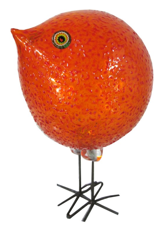 This cute orange glass bird PULCINO was created in 1963 by Alessandro Pianon (1931 - 1984) for the Italian Murano glass firm, Vetreria Vistosi and numbered model 193 in their catalog. The bird has a textured glass body, clear glass thighs, copper legs and Millefiiore eyes. He measures 5 ½” x 4 ¾” and stands 9” tall.