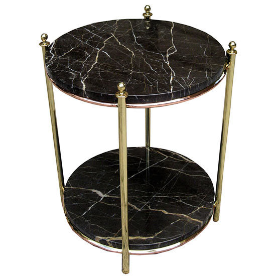 This French art deco occasional table was designed by Jacques Adnet ca. 1940 and is of brass and copper with two marble surfaces of black and brown marble with white inclusions. The table is 21” diameter and 22 ¾” high at the table top. The brass and copper have been polished and coated with clear lacquer to prevent tarnish.