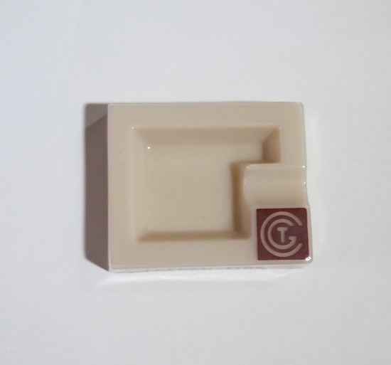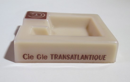 Jean Luce (1895-1964) designed this ashtray for the SS Normandie ca. 1930. The owners of the Normandie, Compagnie Generale Transatlantic, first had the ship’s name on the ashtray, but they disappeared into purses and pockets as souvenirs, they had the name over painted. A third version replaced the name “Normandie” with “French Line”. This version is of tan glass, it has the CGT emblem on top, “French Line” on one side and “Cie Gle Transatlantic” on the other. It is molded on the base “opalex” and “Made in France”. The ashtray is 3 ¼” by 2 ¾”. It is in excellent condition.