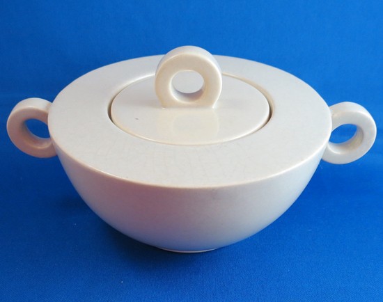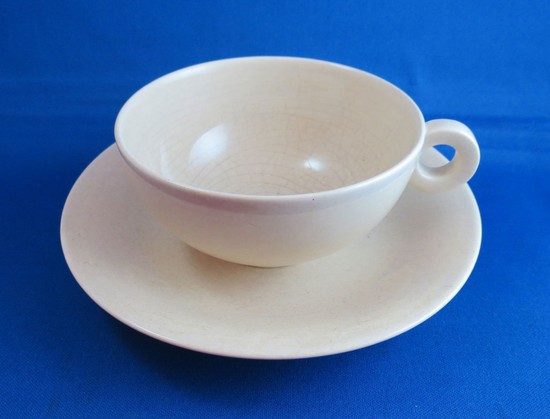 This French art deco fourteen piece porcelain coffee service for six was designed by modernist Jean Luce (1895-1965). The ring handles and finial of the sugar and creamer are repeated on the cups. Each piece is marked with Luce’s cipher. There are no chips or cracks; the cups have crazing on the interior as is usual.