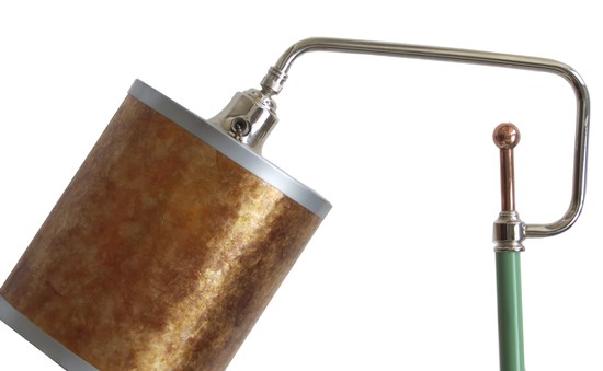 This rare and important American art deco floor lamp was designed by KEM Weber (1889 – 1963). The circular chrome base has a chrome center. The inner portion of the base, the ball and the shaft of the lamp are enameled in Weber’s 1927 green paint. Above the base are three "tulips" graduated in size, chrome on the outside and copper in the inside. The upper portion of the shaft has three smaller "tulips" again graduated in size in chrome, copper and chrome order. The upper portion has a tall copper finial. A chrome bar supports a new mica shade. All metal parts have been cleaned to remove any dirt and corrosion. The true color of the green was taken from an area of unexposed paint under the chrome center of the base. The lamp has been rewired and is in excellent condition.