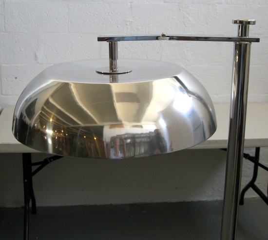 Kurt Versen (1901 - 1997) designed this American art deco aluminum and chrome floor lamp in the 1930’s. The lamp performs two functions; with the bowl up it is a torchiere, flip the bowl down and it is an excellent reading light, with Versen’s signature offset standard on the base. The lamp is 62" high as a torchiere, and 56 ½" high as a reading lamp. The fixture has been rewired, the metal polished and clear lacquered to protect it.