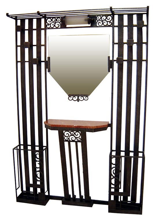 This large French art deco hand wrought iron hall tree dates from the 1930’s. The stand features a hat rack across the top, six coat hooks, a light, two umbrella/cane holders and a marble shelf for keys and change. The hall tree, which displays a variety of ironworking techniques, is 51 ½” wide and 75” high yet is only 10” deep.