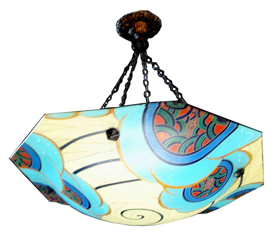This 1920’s French art deco ceiling light is by Loys Lucha. The geometric floral design in soft pastels is achieved by fusing enamel on glass. The light is signed “Loys Lucha” and has period chain and celing cap. The fixture drops 17” from the celing and is 17” in diameter.