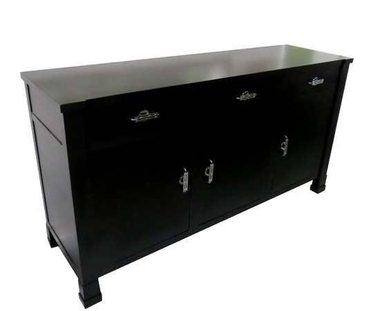 This very streamline 1960's sideboard was manufactured by the Baker Furniture Company. The sideboard has been refinished in black mat enamel and the handles are American Art Deco at its best! It has three drawers (one with felt bottom and divisions for flatware) and three doors with shelves behind each door. The sideboard is 34 1/4" high x 64 1/4" wide and 19" deep.