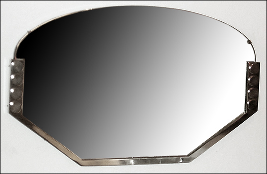 A French art deco nickel plated mirror dating from the 1930's. The five-sided frame is decorated with four 1 1/4" raised circles on each vertical side. The mirror measures 30 1/2" wide and 18 1/2" high.