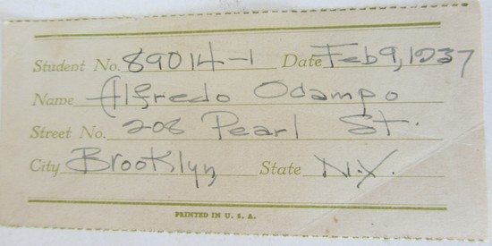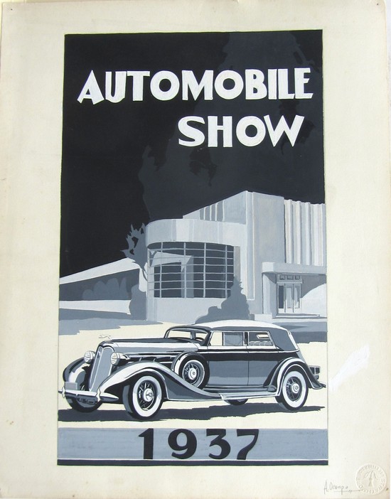 This American art deco pen, ink and gouache drawing was done in 1937 by Alfredo Ocampo of 208 Pearl Street, Brooklyn, New York. It is signed, away from the image, and in pencil "A. Ocampo". The drawing shows a sleek luxury automobile in front of a very art deco building with "Automobile Show" above and "1937" below. The image is 12 3/8" x 7 ½", the paper is 14 ½" x 11 3/8". We know nothing about Ocampo except he worked at Bethlehem Steel during the war years.