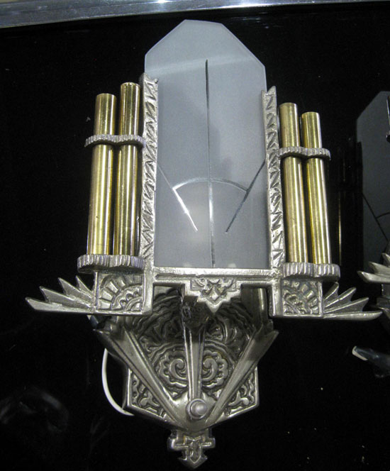 These “Over the Top” American art deco wall sconces are from the 1920’s. The aluminum body is cast in geometric designs and each sconce holds four brass cylinders. Light is diffused through a frosted glass panel. The sconces each measure 8” wide x 12” high x 3” deep.