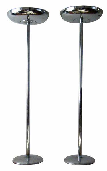 Kurt Versen (1889-1943) designed this powerful pair of American art deco torchieres in 1934. Their arrival was announced in the November 1934 issue of Arts & Decoration magazine. The lamps are chromium plated and have been rewired. They stand 69" high and the bowls are 20" in diameter.