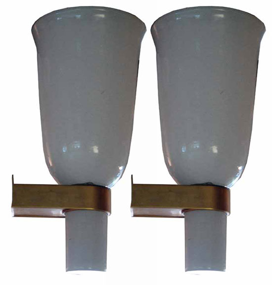 A pair of very high quality Italian art deco Murano glass and bronze sconces. Dating from the 1930’s, the sconces feature a bell shaped bowl extending through the bronze mounting ring to terminate in a cylinder below. The sconces are 15” high and measure 7” in diameter across the top rim. They are in excellent condition and are rewired for American electricity.