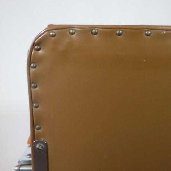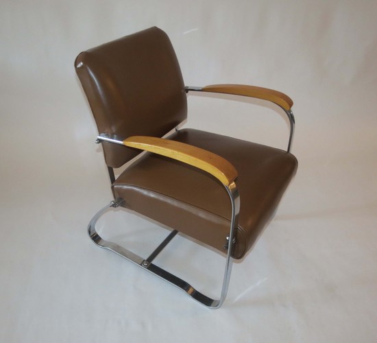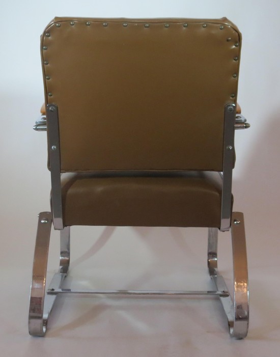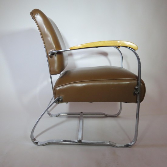 This pair of American art deco chairs was produced in the 1930s by McKaycraft Furniture for the McKay Company, Pittsburgh, PA. The chairs are machine age masculine with sturdy members of flat band steel with blond wood arms and their original light brown vinyl upholstery. The chairs are marked with a decal “McKaycraft Furniture…By the McKay Company, PA. Made in US”. Each chair is 33“ high, 27” deep, and 23 1/2” wide.