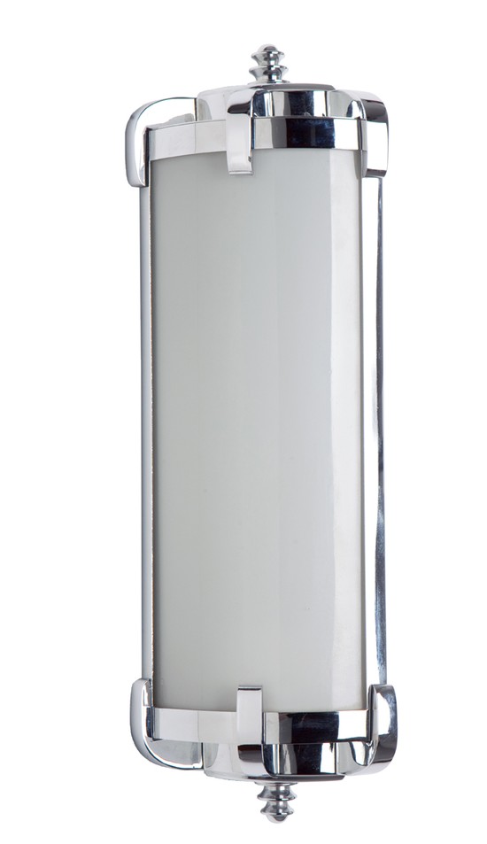 This pair of American art deco corner wall sconces are from the 1930’s. The sconces are made of nickel plated brass with a milk glass shade. They are heavy and well constructed with a stepped final on top and bottom. Each is 17” high. 6” across and 4” deep. They have been replated and rewired.