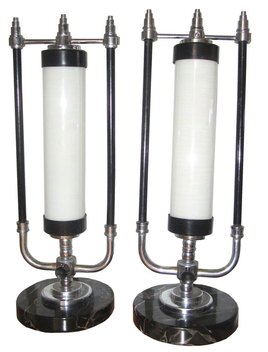 This pair of American art deco tube lamps are from the 1930’s. The lamps have a marble base sitting on three chrome feet, a chrome and black metal structure and milk glass shade. The three "sky scraper" finals on each lamp add a futuristic touch. The lamps are 15" tall and have been rewired.