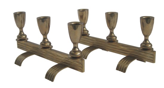 This pair of heavy bronze American art deco candlesticks are from the 1930’s. A ribbed bar sitting on two similarly ribbed curved and streamline feet supports three candle holders. The sticks are each 5” high x 10” wide and 3 5/8” deep.