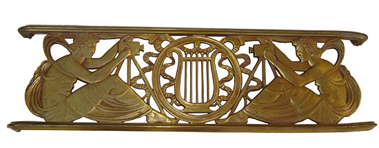 This pair of American Art Deco theatre door handles are from the famous Rapp and Rapp New York Paramount Theatre at Times Square. The 3364 seat Paramount opened in 1926 and closed its doors as a movie house in 1964. These door handles are cast of bronze and each shows Greek muses operating movie cameras flanking a beribboned lyre. The handles measure 26” wide, 7-1/2” high and 1-3/4” deep.