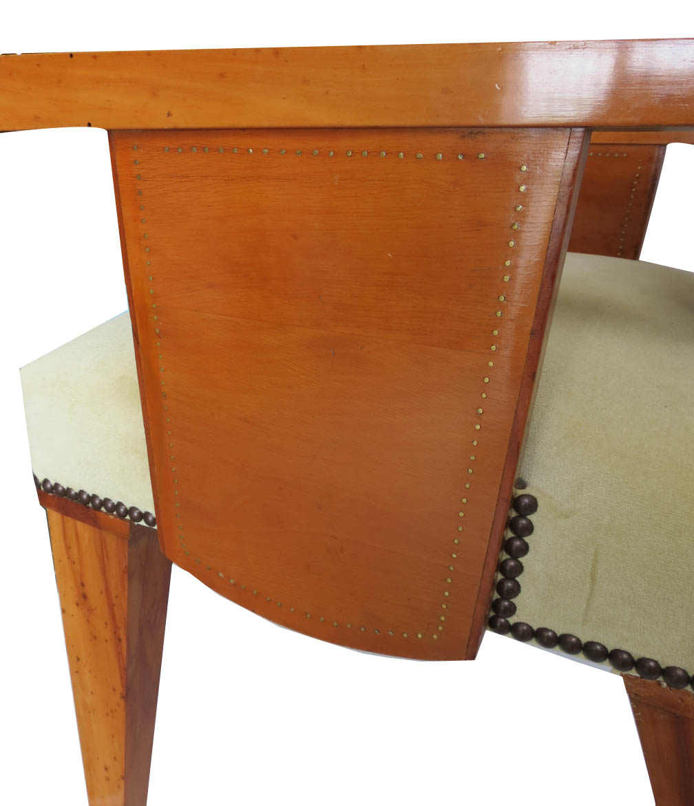 This pair of French art deco arm chairs was designed and made by the Master Andre Sornay (1902 - 2000) in Lyon, France. The chairs are constructed of blond maple and are decorated with tiny brass nails an effect Sornay called “Le Cloutage” and which he patented in 1932. The upholstery on both seat and back is held with closely spaced brass upholstery tacks. Each chair is 32” wide 23” deep and 36 ½ high.