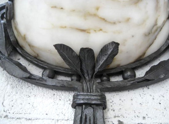 This pair of large hand wrought iron and alabaster wall sconces are quite interesting. Created in the style of Paul Kiss by a master craftsman, the attention to detail is superb. The bowl holds two bulbs giving a fine upward light with a warm glow through the alabaster. The sconces each measure 23 ½” high, 20” wide and project 6 ¾” from the wall.