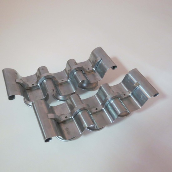 Norman Bel Geddes (1893-1958) designed this pair of satin chrome candle holders for the Revere Copper and Brass Inc. They were introduced in 1935 with their first gift catalog as the no. 135 tuxedo candlesticks. The catalog raphodises “A gentle grace and a flowing rhythm of design seldom caught in any but the finest handmade article”. Each holder accommodates 3 candles and is marked “Revere, Rome, NY”. They are 7 1/8” long, 2 ¼” wide and 2 ¾” high.