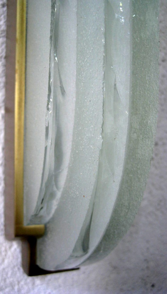 This pair of 1930’s French art deco wall sconces was originally designed in 1936 for the Palace of the League of Nations by Jean Perzel (1892 – 1986). The sconces have a bronze body, brass bowl, frosted glass collar and four individual long cast glass inserts. Fitted with two bulbs, the sconces cast a white light upward while the collar and cast glass pieces give your room a warm glow. The scones have been rewired for American Electricity, are impressed “Perzel” and measure 18” wide x 21” tall and project 9” from the wall.