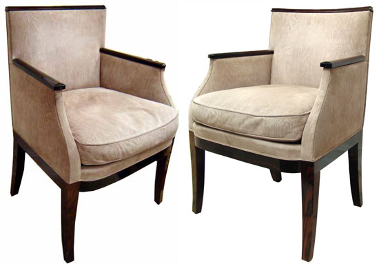This pair of French art deco arm chairs were designed and constructed ca. 1935 in the workshop of Alfred Porteneuve (1896 – 1949). Porteneuve, the nephew of Jacques-Emile ruhlmann editioned his furniture in Ruhlmann’s later years and after his death in 1933 continued the tradition of quality craftsmanship. These chairs are of macassar ebony with an upholstery of moiré silk pattern suede. The chairs measure 24” wide x 20” deep and 33 ¾” high.