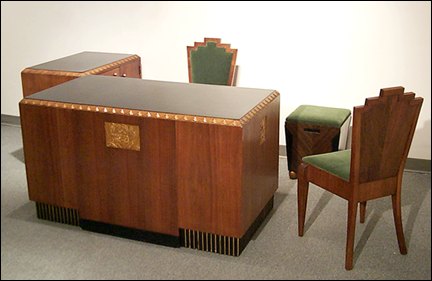 This office set which consists of an executive desk, small side desk, two chairs and a wastebasket/seat is an historic and beautiful example of American art deco. The Oakland Paramount Theatre was built in 1930 and opened in 1931, an art deco monument, it was designed by Timothy Pflueger. In 1972, Jack Bethards was hired to manage the theatre and supervise its renovation. On his first day on the job, Bethards found this set of office furniture in the trash outside the theatre...on its way to the dump. He rescued it and had it reinstalled in his office where it stayed until his retirement. The pull-out slide shelf in the desk still has the intercom numbers for the theatre taped to it. This is a "once-in-a-lifetime" chance to own an important, functional and very art deco office suite. Check out the Paramount Theatre web site at www.paramounttheatre.com