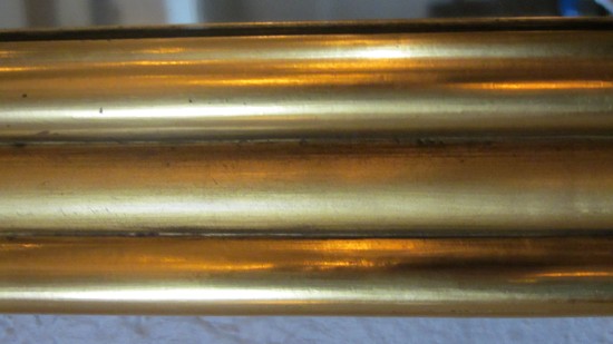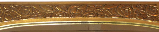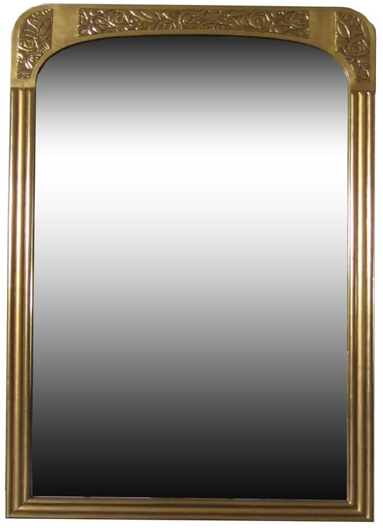 This French art deco mirror is by Paul Follot (1877 - 1941). The gold leaf surround has three panels of geometric roses and foliage and raised "speed" lines on the left, right and bottom. The original mirror plate has a 1" bevel and is signed and dated on the back "PF" and "13 – 10 - 1933". The mirror is in excellent condition and is 54 ½" tall and 33 1/4" wide.