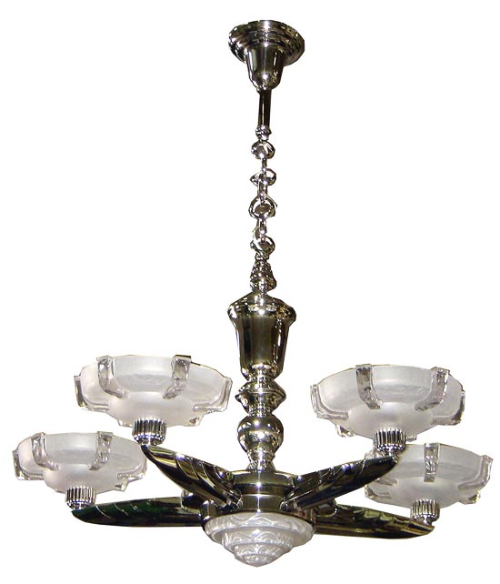 This This Atelier Petitot chandelier features five bowls in satin glass with raised “chipped ice” vertical bands and a four stepped center also of the same glass. The body of the fixture is of bright nickel with a stepped ceiling cap and radiating arms which mimic the Chrysler Building. The fixture drops 37” from the ceiling and is 29” in diameter.