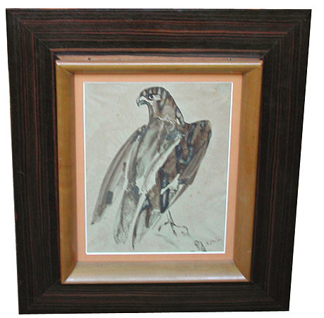 Raymond Bigot (1872 - 1953), French, along with Paul Jove, Jacques Nam and Henri Deleurmoz revitalized the French "Animalier" tradition. This watercolor of a stern and regal eagle is in its original macassar ebony frame which can be hung from a wall or placed on a piece of furniture. The watercolor measures 10" x 8" and the frame measures 18 1/4" x 16".