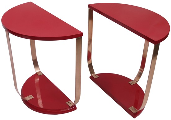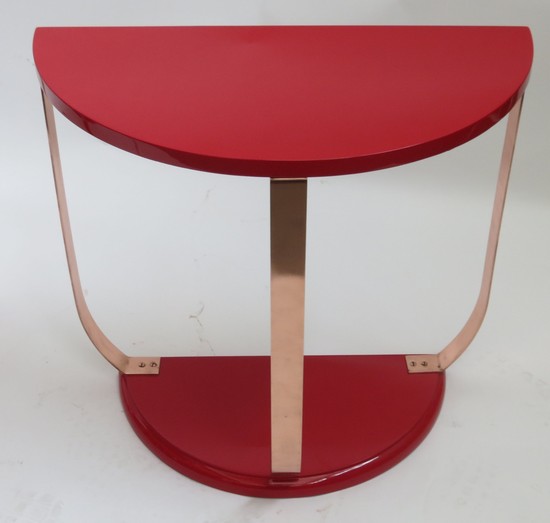 A striking combination of red lacquer and bright copper. This pair of American art deco demilune side tables were a product of The American Specialty Corporation of Indianapolis, Indiana in the 1930's; one of the tables is so marked. A new finish of red lacquer has been professionally applied and the copper polished, then clear lacquered so fingerprints and weather will not disturb the beauty of the tables. The tables are very well made… even the screws are made of solid copper. Each table is 23" high, 24" wide, and 12" deep.