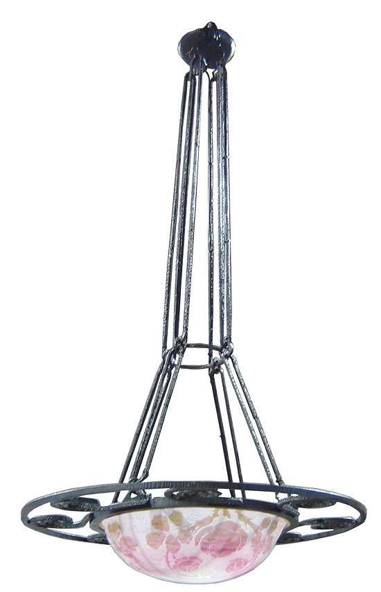 This is an exceptional French art deco chandelier from the late 1920’s. The wrought iron fixture drops 49” from the ceiling and contains a cameo glass Le Verre Francais bowl by the French master Charles SchneiderCharles Schneider