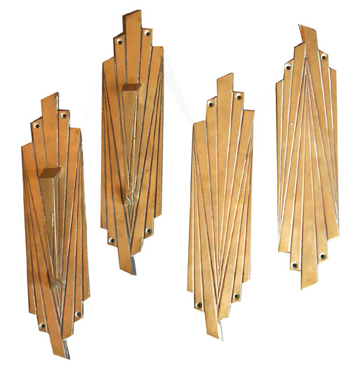 This American art deco set of bronze door handles and push plates dates from the 1930’s and comes from a Miami Beach Hotel. The four pieces are of solid cast bronze and are deeply incised in a geometric pattern. Each measures 15 ¼” high and 3 ½” wide.