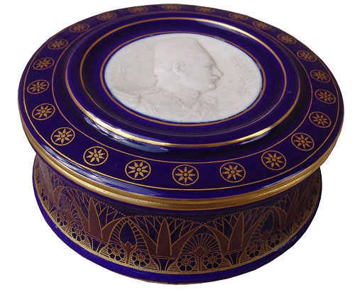 This French art deco porcelain bonbonniere was created by the French national porcelain manufactory at Sevres in 1925 to be presented at a dinner given by Mahmoud Fakhry-Pacha, the Egyptian ambassador to France on October 9, 1925 in Paris. The legend "Offert par Fakhry-Pacha, Paris, le 9 Octobre 1925" in gold inside the lid. The lid and sides are in the Sevres blue decorated in gold with the side decoration inspired by the soon to close Paris Exposition. The lid has at its center a bisque portrait of the host. The box measures 4 1/4" in diameter and is 2" high. The base is marked with a black striped cartouche containing a capital "S", the date 1925, and the letters "DN". There is also an orange stamp containing "RF" (Republique Francaise), "Manufacture Nationale", "Decore a Sevres" and the date "1926".