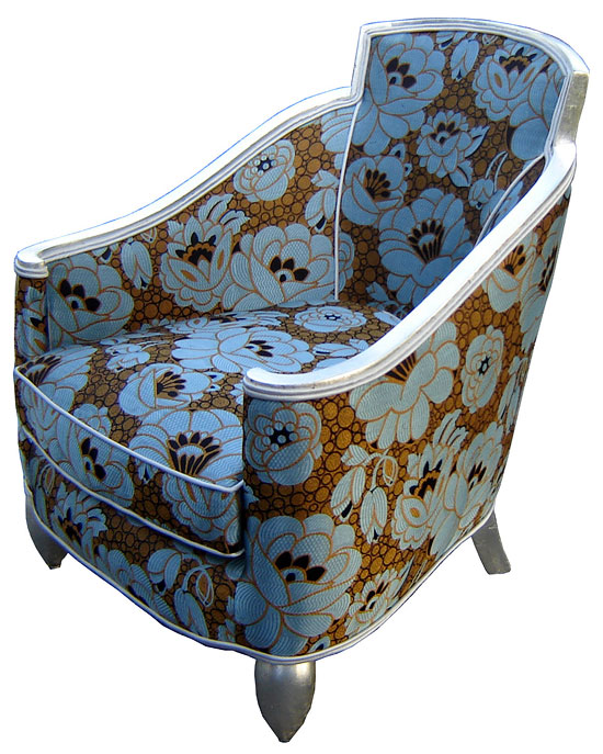 This French art deco bergere dates from the late 1920s and has been refinished in silverleaf applied by the traditional hand method. The chair has been re-upholstered in Prelle “Water Lillies” fabric of cotton and silk. The chair measures 23-1/2” wide x 32” deep and 29” high.